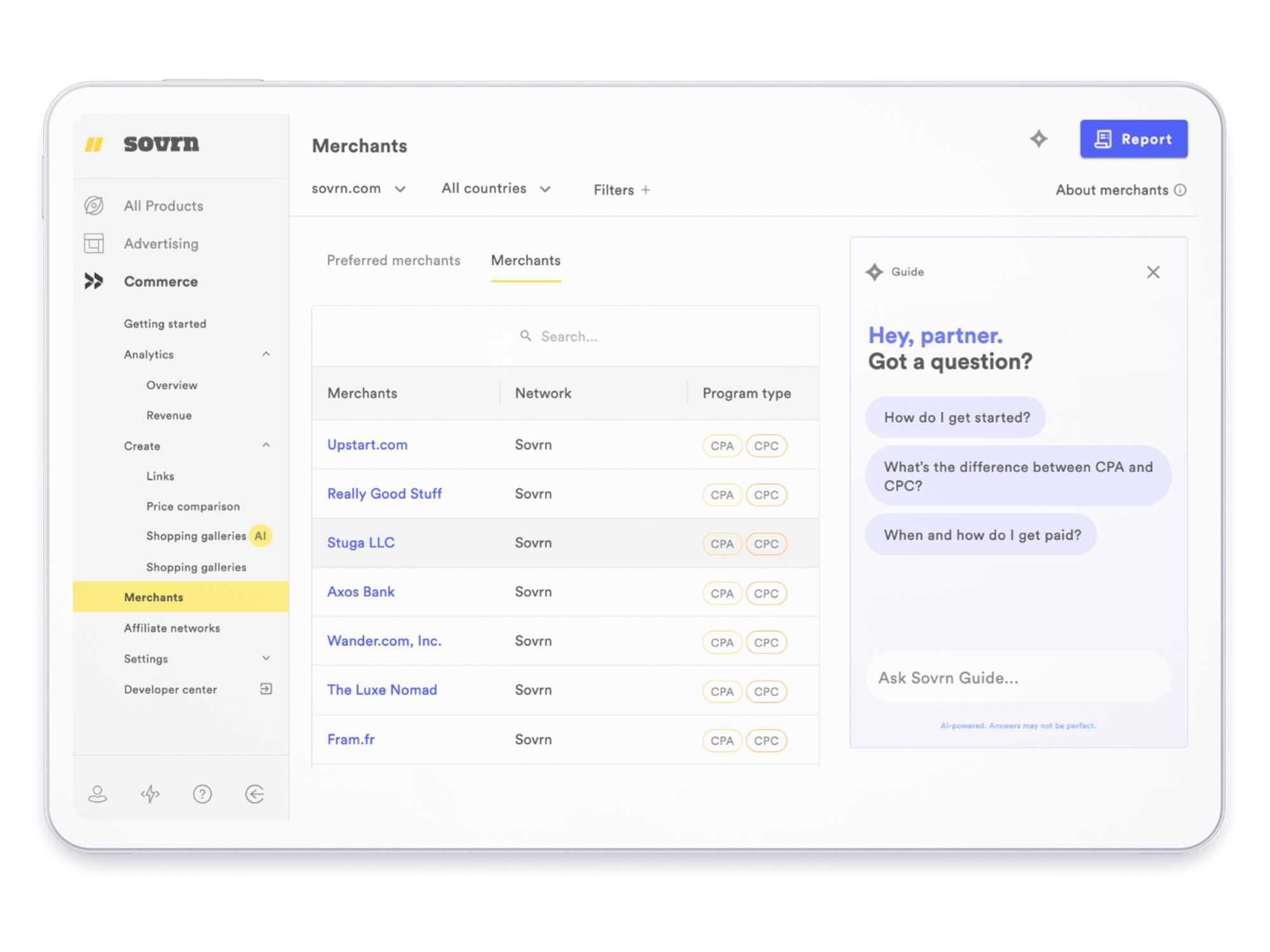 The Sovrn AI Guide lives directly inside the Sovrn platform, so help is always just one click away. Whether you’re in the middle of setting up a campaign, trying to identify which merchants are offering the highest commission rates right now, or exploring a feature you haven’t used before, the AI Guide surfaces the answers you need in seconds, not hours.